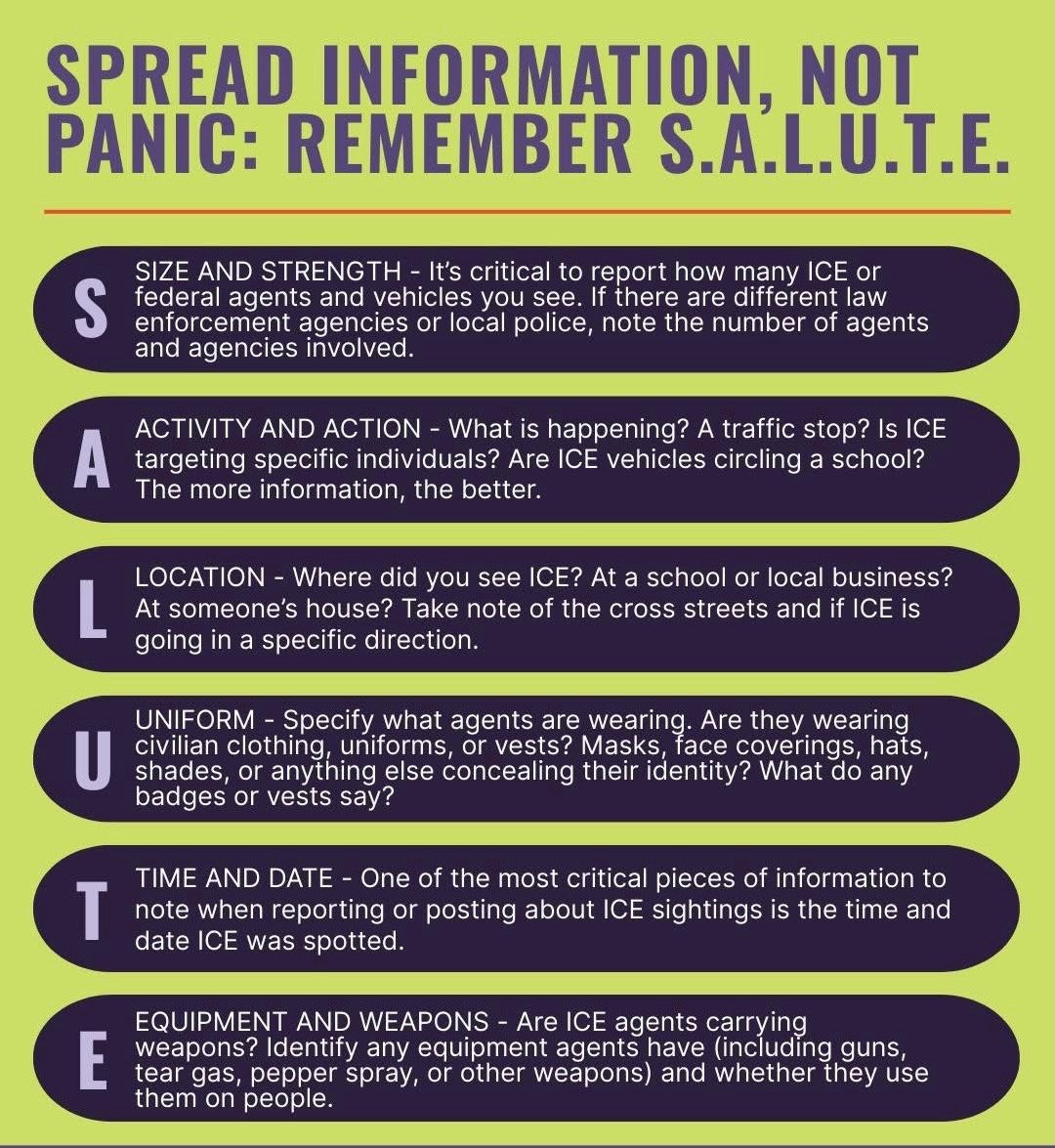 PLEASE ADD THIS PHONE NUMBER TO YOU PHONE CONTACT LIST! Call this number immediately if you see any ICE agents. You have the right to film activity in public spaces. Record from a safe distance and SALUTE (see photo). Alex Pretti and Renee Nicole Good’s murders showed us how vital ALL recordings are , so please, even if 20 other people are recording don’t stop.